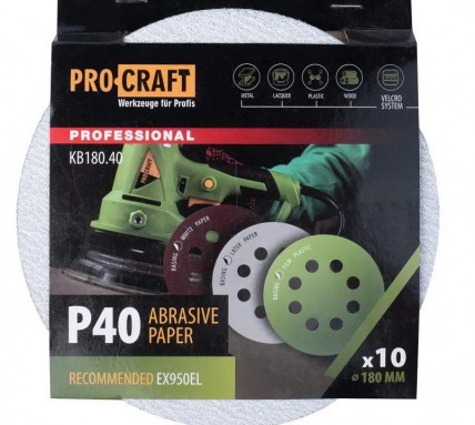 - Круг шлифовальный самозацепной Procraft KB180.40 UNIVERSAL (набор 10 шт.) 8 отв.