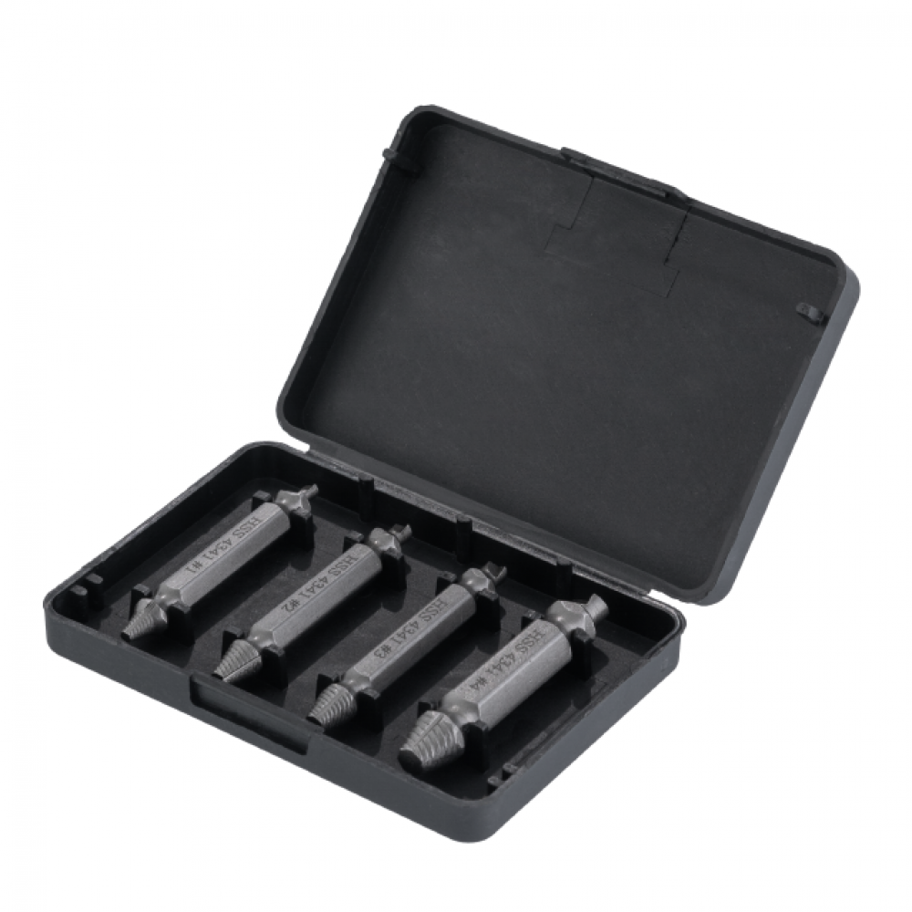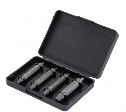 Набор содержит четыре самых популярных размера экстрактора: 5, 6, 8, 10 мм. Размер подбирается исходя из параметра крепежа. По диаметру он не должен совпадать или быть больше диаметра извлекаемого крепежа.