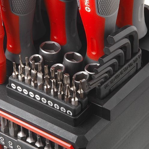 Помимо отверток и бит, в наборе также представлены торцевые головки для разных крепежей. Высокоточные отвертки, набор прецизионных бит и держатель к ним для точной работы с электроникой, различными мелкими деталями и механизмами. Два набора шестигранных Г-образных ключей метрических и дюймовых размеров позволяют выбрать подходящий шестигранник.