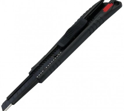 Нож прорезиненный корпус с металлическими направляющими, лезвие SК2 сегментировано 9 мм с 3-х гранной заточкой, в блистере HAISSER – для разрезки плотной бумаги, картона, гипсокартонных плит, пленки, линолеума, кровельных материалов, изделий из резины и кожи и других материалов. Режущая кромка изготовлена из прочной высококачественной стали Sk4 с трехгранной ультра тонкой заточкой. Металлическая направляющая лезвия и блокировка лезвия.