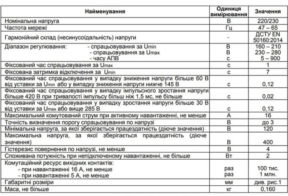 Основные характеристики Однофазное реле напряжения РН-116