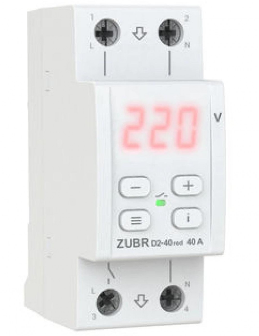 У ZUBR D2 red очень удобное стандартизированное подключение вход-выход, отсутствует необходимость использования нулевой клеммы при подключении. Настройка работы устройства осуществляется с помощью всего лишь трех кнопок. Четверная кнопка "i " предназначена для просмотра журнала аварийных срабатываний и расшифровки аббревиатур пунктов меню. Цифровой экран постоянно отображает значение напряжения, а также выводит системную информацию. Доступна возможность настройки яркости экрана и индикатора в режиме ожидания.