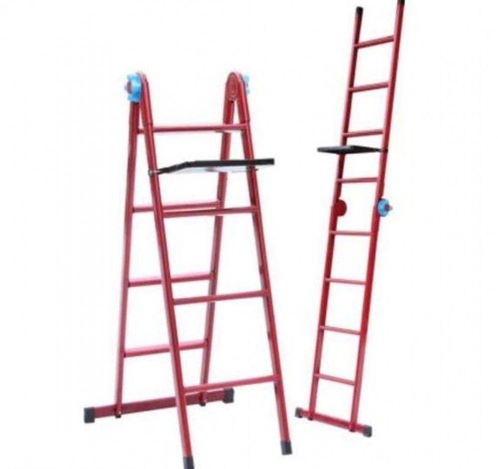 Лестница универсальная изготовлена ??из стальной трубы толщиной стенки 0,8 и 1,0 мм. Способна выполнять функции лестницы-лестницы и приставной . , а также преломление в положение «приставные». Лестница универсальная комплектуется грузовым столиком, который можно, в зависимости от потребностей работающего, крепить корытом вверх (ложить в него инструмент и метизы) и корытом вниз (ставить на него ведро с краской или раствором весом до 40 кг).