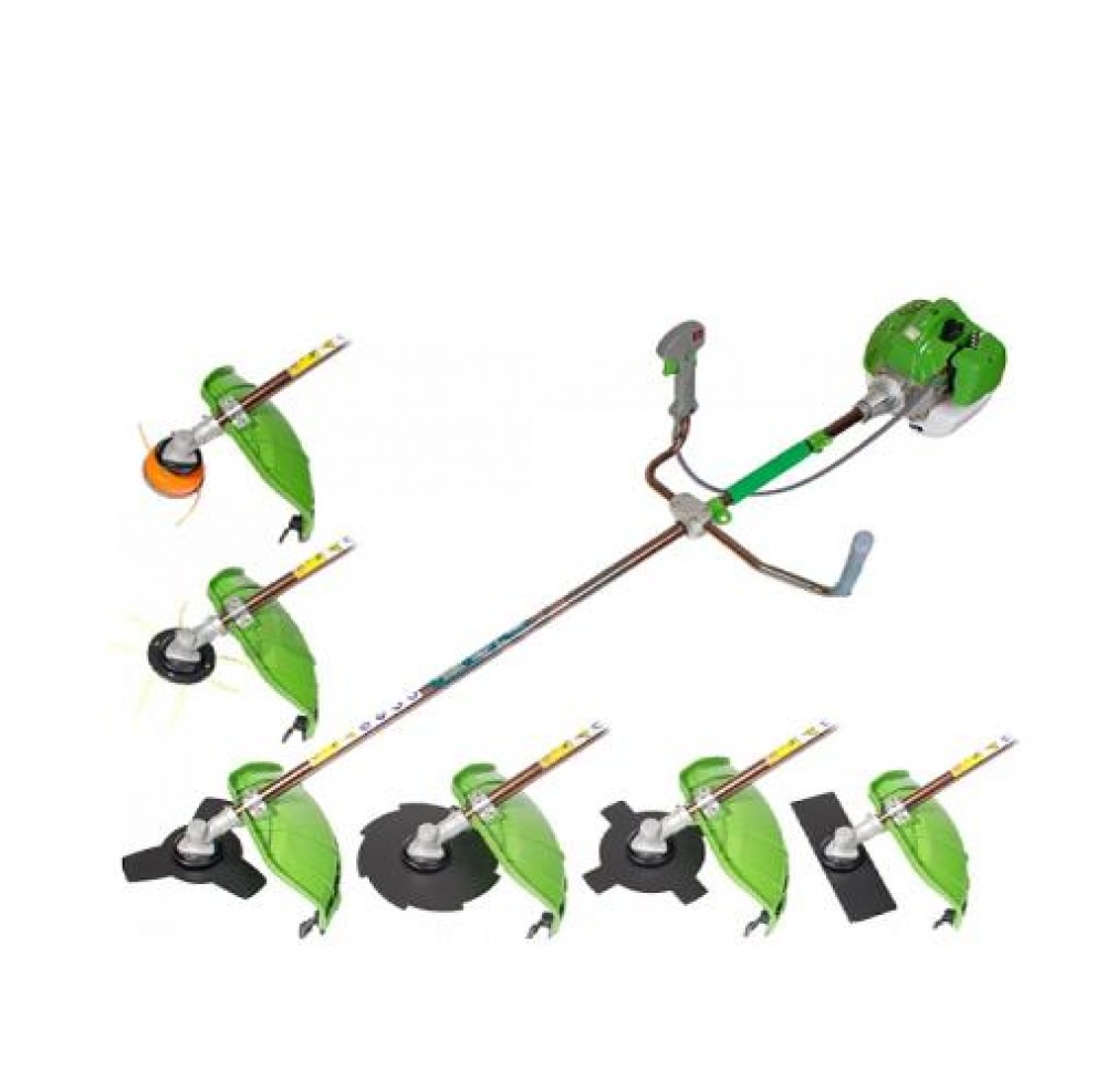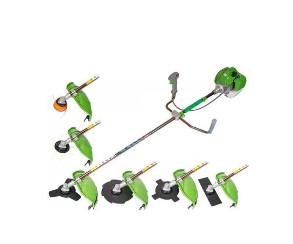двигателю на 5500 Вт., он мобилен и мощен, но несмотря на это легок и вынослив. Мотокосу можно оснастить как леской так и ножами, по этому она может резать растения