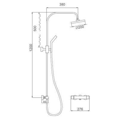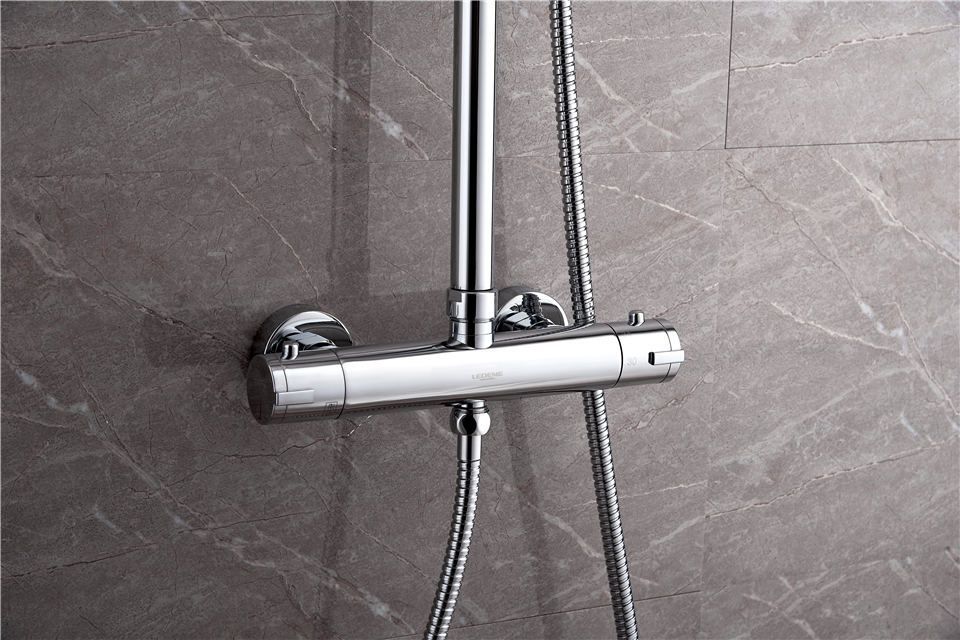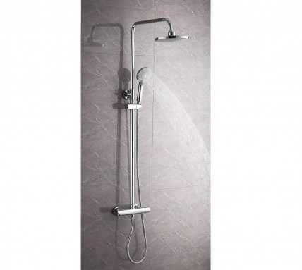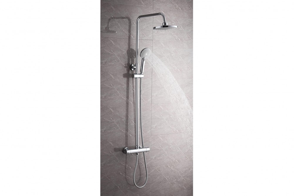 Комплектация: смеситель, душевой шланг, душевая лейка, стойка с тропическим душем и креплениями, монтажный комплект