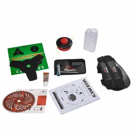 | Комплектация | Мотокоса, раздельные рукоятки, ёмкость для топлива, набор инструментов и крепежей для сборки, ранцевая жилетка, полуавтоматическая шпуля 1 шт, нож 3 лепестковый, мультизубчатый нож 40 лепестковый, защитный кожух, неподвижный режущий нож для лески, сумка, инструкция |