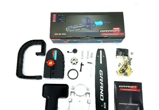 Насадка пила цепная Grand 300QF PRO изготовлена из качественных материалов, а также имеет дополнительную рукоятку и металлический кожух защиту.