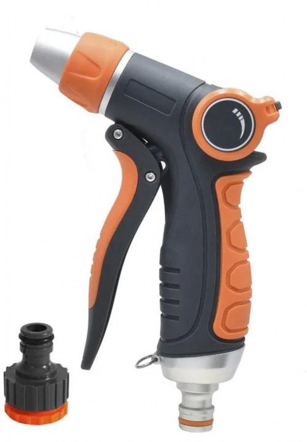 Пистолет применяется как для полива растений так и для очистки приусадебной теретории, мойки автомобилей. Поворот сопла позволяет регулировать струю от мощной до мелкого дождя. Соединяется с поливочным шлангом с помощью коннектора на любой диаметр шланга