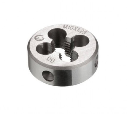 Плашка используется для создания или восстановления наружной резьбы, размером M10 с шагом резьбы 1,25 мм. Широко используется для различных металлов: чугун, медь, латунь, сталь и другие металлические материалы. Плашка работает в паре с держателем плашек для ручной обработки.