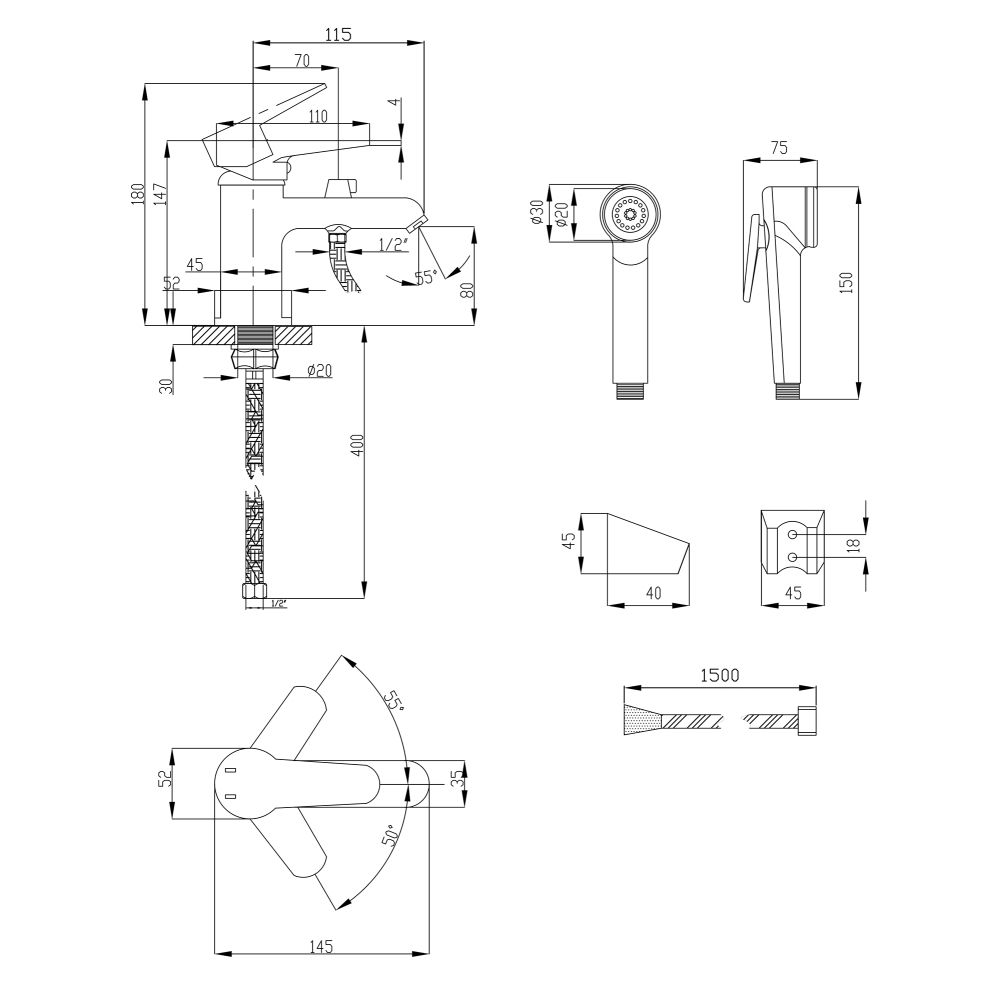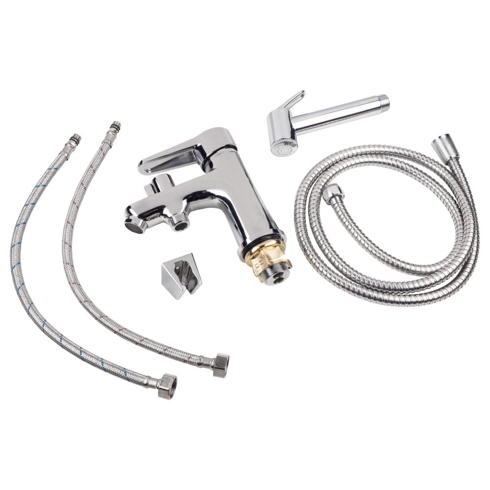 Комплектация Смеситель, гибкая подводка, лейка для биде, душевой шланг, кронштейн, крепежи.