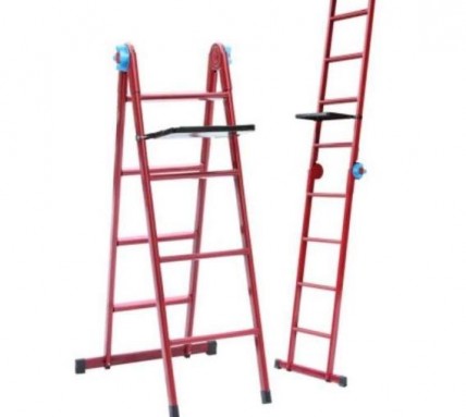 Лестница универсальная изготовлена ??из стальной трубы толщиной стенки 0,8 и 1,0 мм. Способна выполнять функции лестницы-лестницы и приставной . , а также преломление в положение «приставные». Лестница универсальная комплектуется грузовым столиком, который можно, в зависимости от потребностей работающего, крепить корытом вверх (ложить в него инструмент и метизы) и корытом вниз (ставить на него ведро с краской или раствором весом до 40 кг).